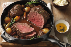 Sear the beef for 1 to 2 minutes on each side until a nice crust forms, then remove it from the skillet and set aside.