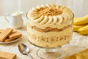 A delightful creamy dessert inspired by Swedish flavors, featuring a rich blend of cream and tangy sour cream, set into a smooth consistency and topped with tart lingonberries.