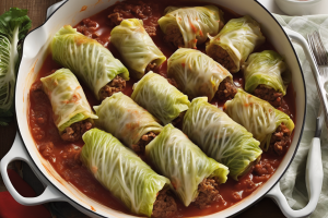 A delightful twist on traditional cabbage rolls, filled with a savory mixture of ground beef and rice, simmered in a tangy tomato sauce.
